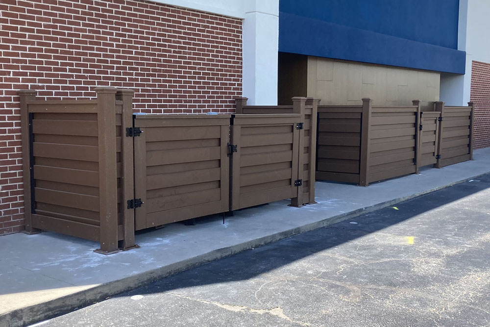 Custom dumpster enclosures are the perfect way to dress up your disposal areas for your business. Dumpsters of any size can be an eyesore and potential security risk if you are disposing of sensitive materials. We provide enclosures in wood, chain link with privacy slats, vinyl and Trex. We can also create a custom look built to your specifications.